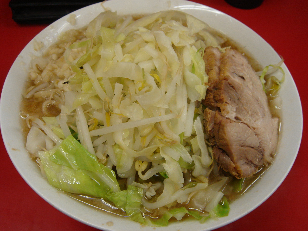 今年389杯目 6/24 ラーメン二郎@ひばりヶ丘 ラーメン野菜ニンニク12時過ぎに着いたら、なんと38番目って、なんじゃこりゃ〜!?結局並んでから食べ終わるまでに1時間40分かかりました。量はまぁまぁ、麺は柔らかめ、野菜はしゃっきり、スープはやや乳化、個人的にはカラメ必須。豚は厚切りチャーシュー風で味薄め。ちょっと調子悪かったのかな?満足度はそんなに高くない。満腹度はやや高い。隣の隣の二人組が「野菜増し増しニンニクましまし」を頼んでいて、別丼に野菜を盛られていた。まるでつけめんみたいだった(笑)。