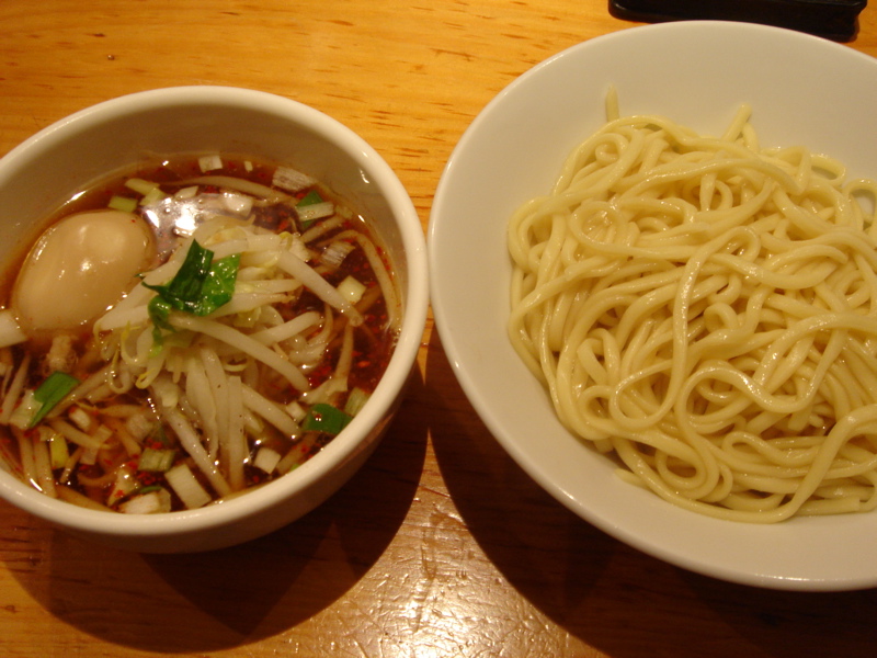 で、やっとその計画を実行する機会がやってきました。残念だったのは、その後、会社に戻って仕事をしなければならなかったのでプハァ〜ができなかったこと。醤油つけめんのあつもり(写真上)に薩摩角煮(写真中)をのっけてしまったのが左の写真。玉子も角煮(これが柔らかくて実にうまい)もほぐしてぐちょぐちょにかき混ぜる。そして、つけ汁は無視して、和え麺状態で食べる。・・・あれ?やはりちょっとタレが足りないかなぁ〜。でも、結構いけました。その後は和えた麺をつけ汁につけて食べるとここで前にやっていた和え麺を思い出した。あれをまた食べたいなぁ〜。(^^;