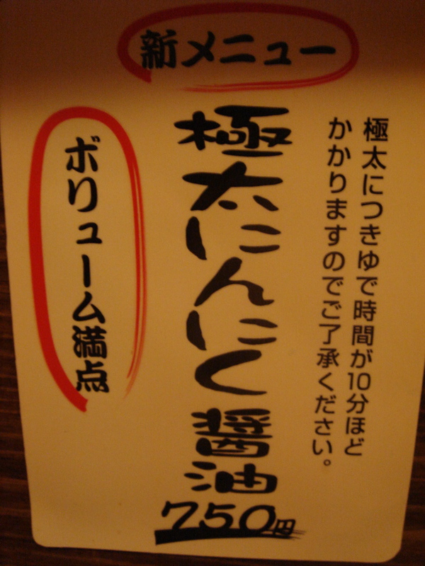 店主が昔、東京に居た時には好んで「ラーメン二郎」を食べたらしい。その流れで出来上がったメニューだと思うが店は「二郎」と言ってるわけではないのでそういう意識で食べてはいけない。メニュー名は「極太にんにく醤油」750円。茹で時間が10分かかると書いてある。この後、飛行機に乗るのでにんにく抜きにしてもらった。それにしても地方にこういうボリューム系が登場すると食べ歩きに組み込むのが大変難しい。さて、食えるか?(^_^;)