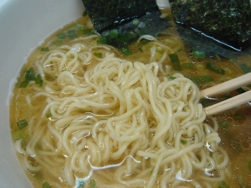 私の写真の撮り方がヘタなので、醤油色っぽく写ってしまってるかも知れません。結構透明度が高いんですよ、このスープ。それでいて、海老度がガツンと高いですから驚きます。それは蓋を開けた瞬間から、ぷわぁ〜っとやってきます。もちろん、スープを飲むと口内海老エビです。それを軽やかな塩味が支えてます。意外と、というと怒られてしまいますが、チャーシューもカップ麺の割にはなかなか。パリパリ海苔も2枚あるので1枚はパリパリのウチに、もう1枚はゆっくりスープに浸からせてから食べましょう。