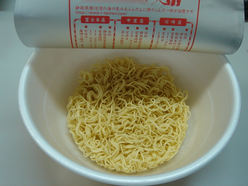上でも書きましたが、この麺が脇役ながらもいい味出してます。海老を引き立たせながら、スープと海老風味を口に運ぶ役割を担ってるわけですね。麺を食べるときには必然的に顔がカップに近づくわけですが、鼻からと口からのダブル海老風味で押し寄せてきます。まるで店主の腕相撲のように。(強いんです。腕太いですし(^^;)「大山」のラーメンを食べたことがない人は「あの力強い店主から、こんなにも優しい味わいが誕生するのか?」とサプライズを堪能してください。