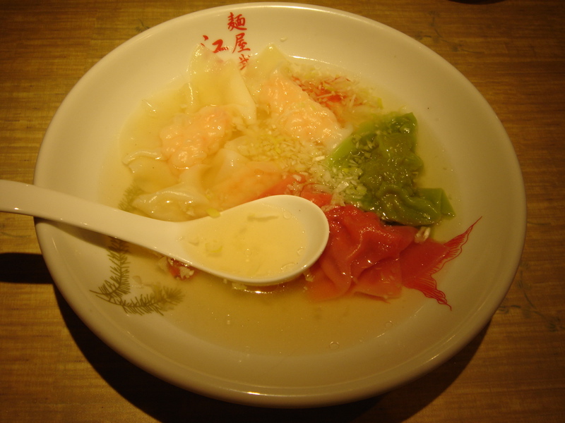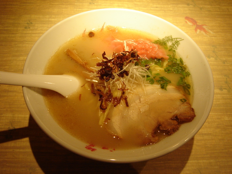 7/17にオープンした「麺屋武蔵」グループの8軒目。浅草にオープンと言うことでコンセプトも今までとは若干違う。そこら中に『金魚』がある。器にもカウンターにも壁にも天井にも。外人や一見さんにはそれだけで楽しんでもらえそう。基本メニューは「江戸きんらー麺」。ワンタンが一個入っている。スープは豚骨ベースに貝を中心とした魚貝系。白濁だが飲みやすい。逆にインパクトには欠ける。