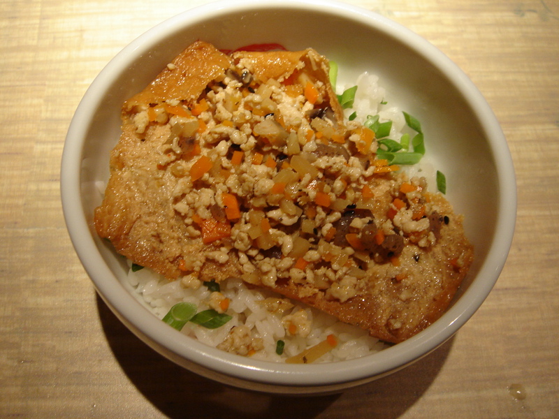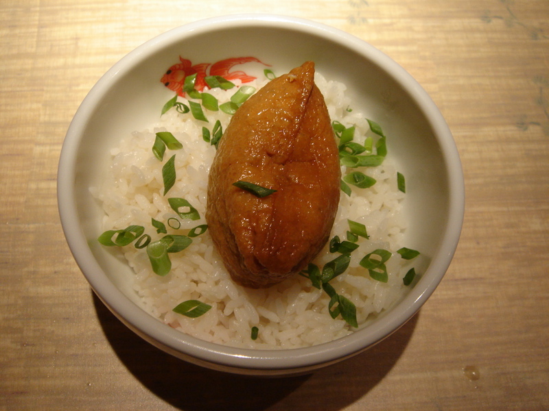 サイドメニューのいなり飯。ご飯の上にいなりがのってきて異様だが、中身は写真右参照。200円なら、まっ、ありかな?(^^;