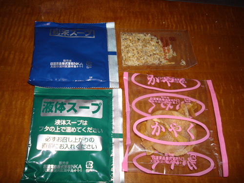 中に入っているのは、粉末スープ・液体スープ・かやく(チャーシューとメンマ)・香り節(国産いわし削り節)の4袋。
