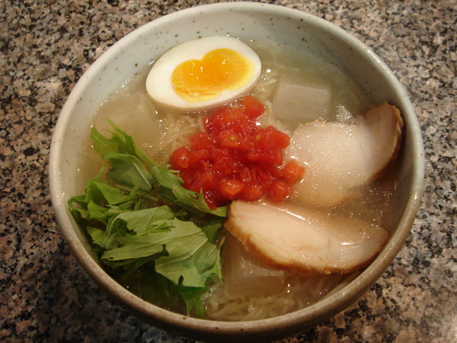 寝坊して出遅れ、12時ちょい前に着いたら一人待ち。あまり長い行列ではなくて助かった。今回は冷やし狙いだが、塩つけが3種類に冷やしが2種類。選んだのは『豆腐とカニの寒天寄せ・海鮮明太子合え「冷やし塩らー麺」冷製むしどり入り1日20食限定』というとてつもなく長いメニュー名。(笑)1050円。他に『塩スープ仕立て冷やしトマト海鮮トウバンジャン合え冷やし塩らー麺』もある。いずれも8月末迄。