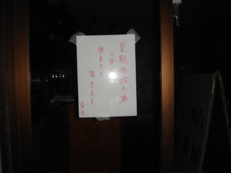 さて、9月に入ってもう秋だと思うが、、、、とお店の前に立つと「夏季休暇に付き、休ませていただきます」だと。夏は終わったぞ〜〜〜と大声を出しても営業再開するはずもなし。。。痛い、痛すぎる。
