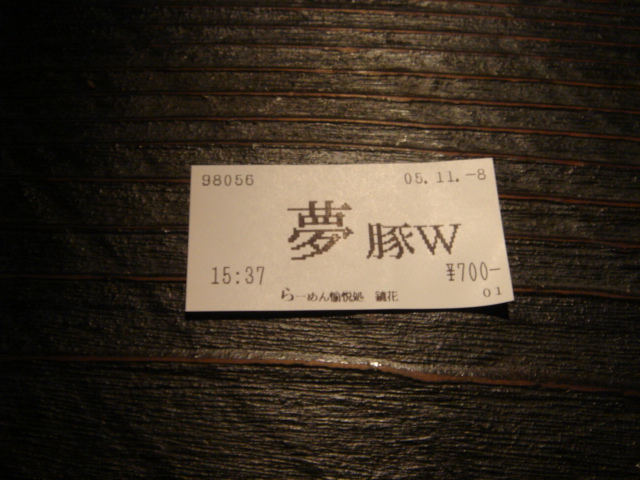 月替わりで内容が変わる「夢」。今月はなんと「二郎インスパイア」らしい。食券を買うと「豚W」の文字が・・・。(^^; もちろん「W」ではないメニューもある。