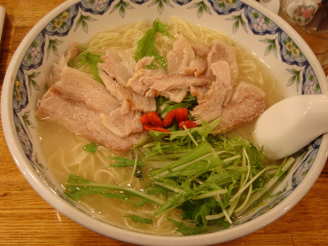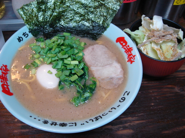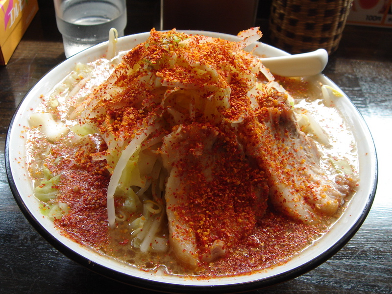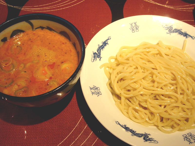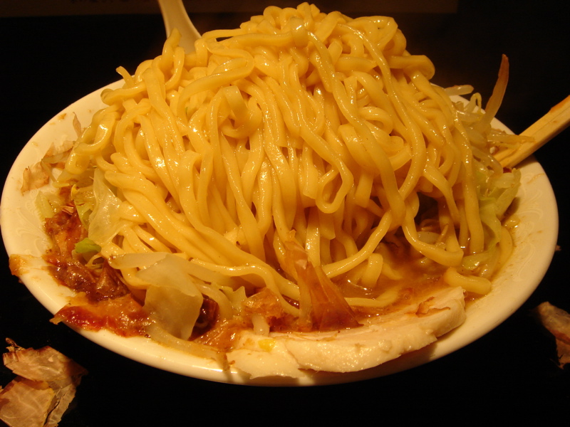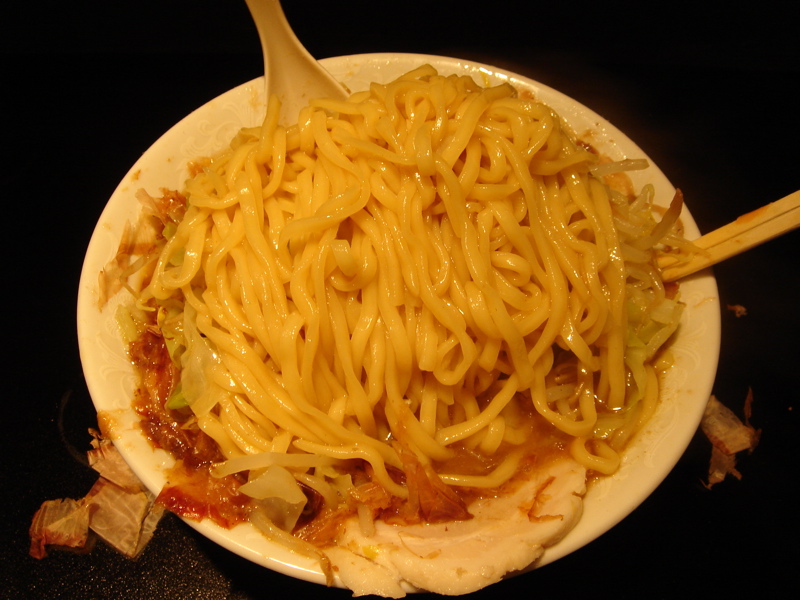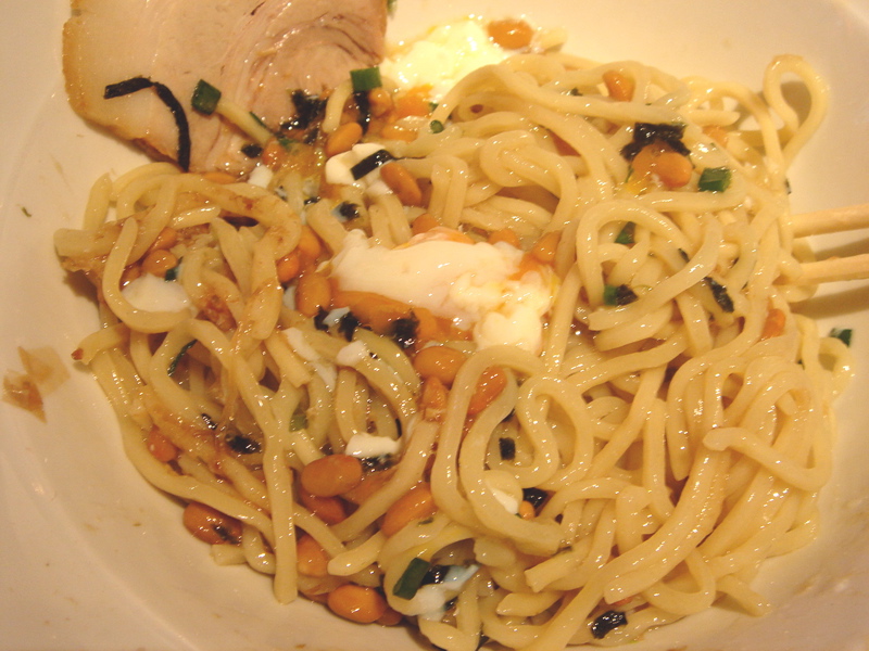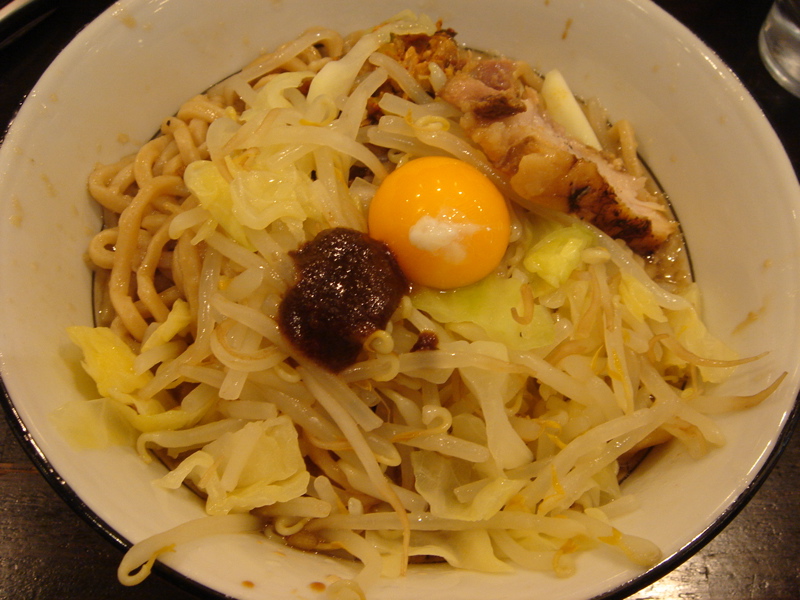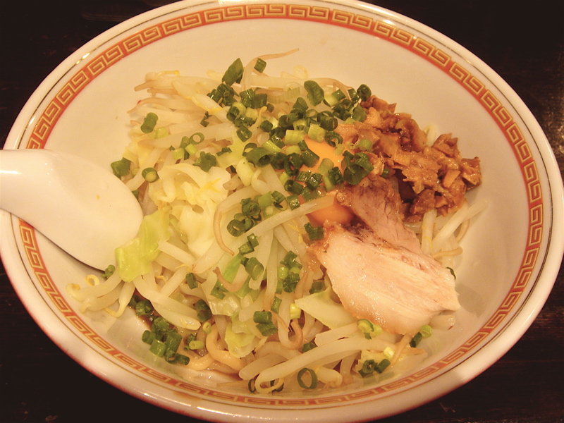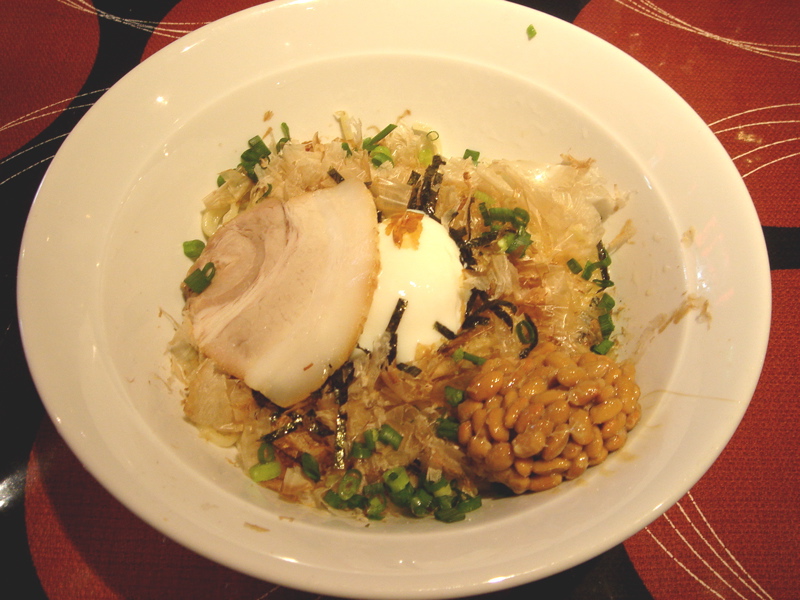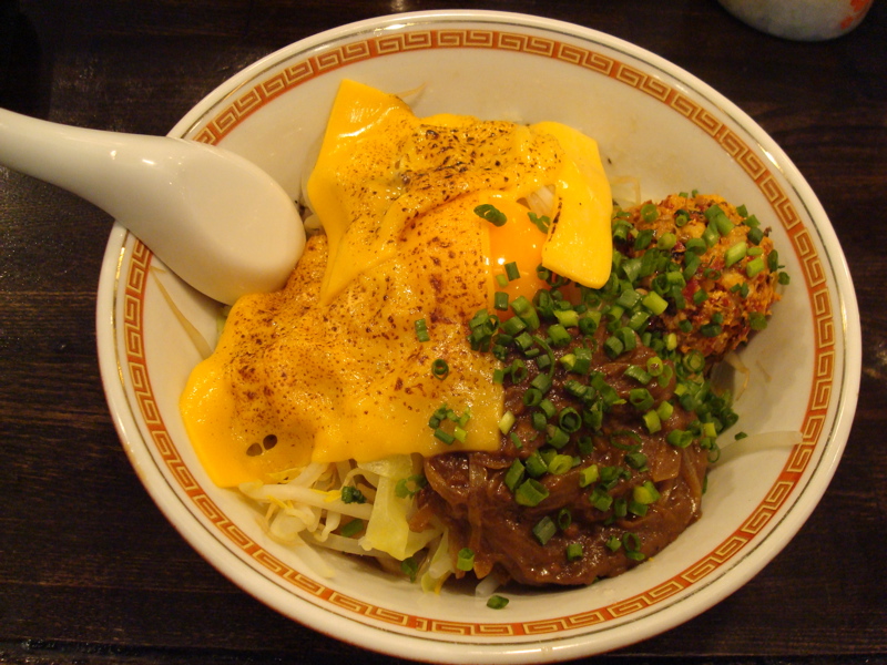 どこかのブログで「華麗なる汁なし」(汁無しのカレー和え麺)にチーズが合う、というのが書いてあって、(忘れてしまってすみません)そりゃ合いそうだ、と思って来てみた。これが予想通りというか予想以上に合う。まずは、何も付いてないあたりの麺をほじくり出して食べる。次にカレーを付けて食べる。次に直前にバーナーで炙ってとろ〜りとさせたチーズ、さらには辛し高菜とチャーシュー合え、卵黄、と混ぜ物が沢山あるのでいろんな変化がある。麺はハーフで十分だと思ったが、やっぱり足りなくなった。(^^;