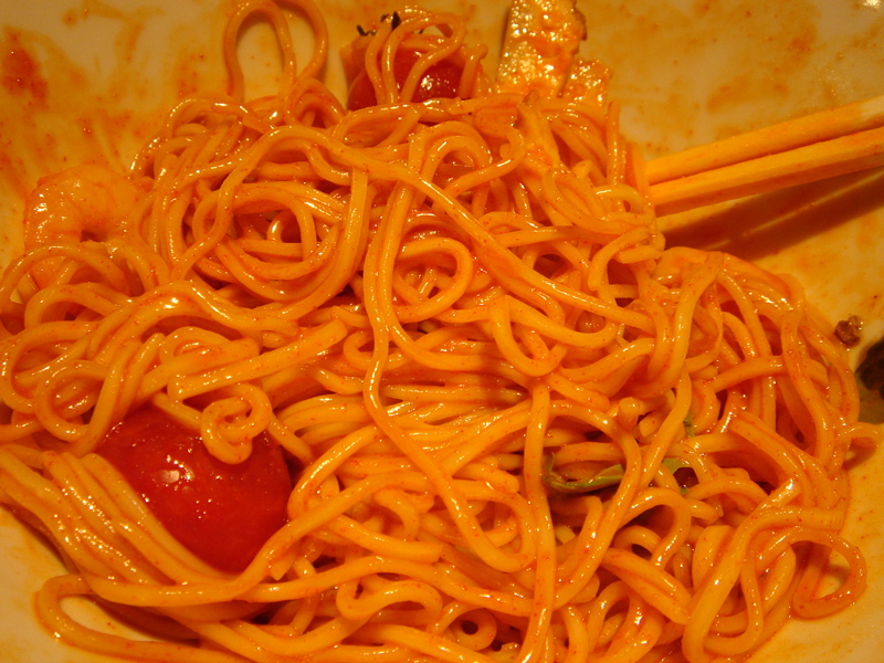 ♪いたこのイタ郎〜♪と同世代にしかわからないような古い歌を歌いながら注文するのは「イタ郎レギュラー」750円。「ぎ郎専門店」ではあるがそのバリエーションの豊富さには驚かされる。しかも、ラーメン店にある「醤油・塩・味噌」というラインアップではなく、カレー、カルボ郎、イタ郎、(その他多数)なんていうメニュー構成だから中華麺を使った麺料理店とも言えるか?(^^; イタ郎はなんとなくカルボ郎に刻みトマトが入ったもの、というイメージで居たが意外と個性があってうまい。休日出社時は田丸に行くことが多かったが最近はこちらが多い。
