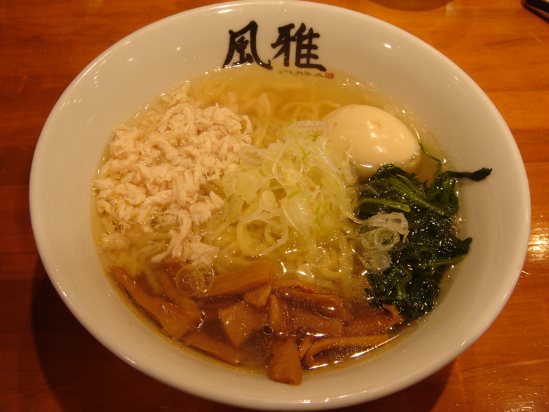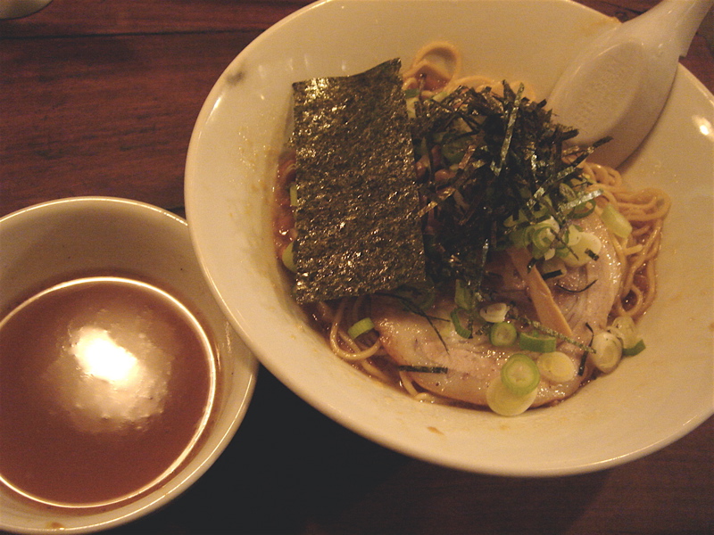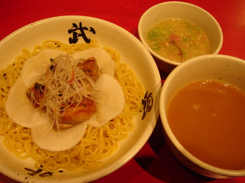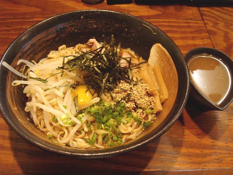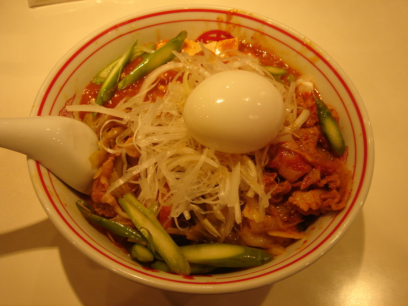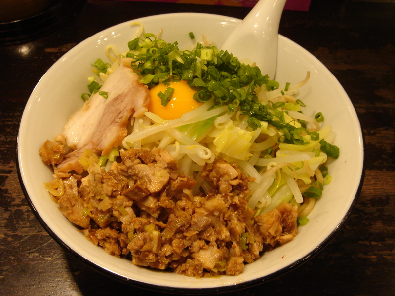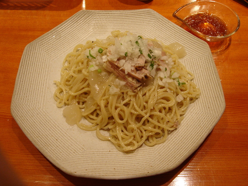 開店五分前に到着、先待ち三人。移転後は初めて。新しく軍鶏冷やし和えそば700円(夏季10食限定)が出たらしいので来てみた。昼は一人でやってるのでカウンターのみ。新作は結構手間のかかっているメニューで大変そうだった。水で締め、ピーナッツオイルやガーリックパウダーなどを和えた麺に軍鶏ダシのジュレをかけ、軍鶏チャーシュー細切り、玉ネギのみじん切りをのせた物。繊細な味わいだが、さっぱりしてうまい。後半、別容器入りのポン酢ジュレを混ぜて食べると、一気に美味さも加速しエンジン全開。味変化系+和えそば系で昨年と今年のトレンドを合体させたようなメニュー。これで700円は大満足で嬉しすぎ。お店のデータは「ラーメンバンク」をクリック!
