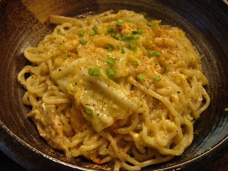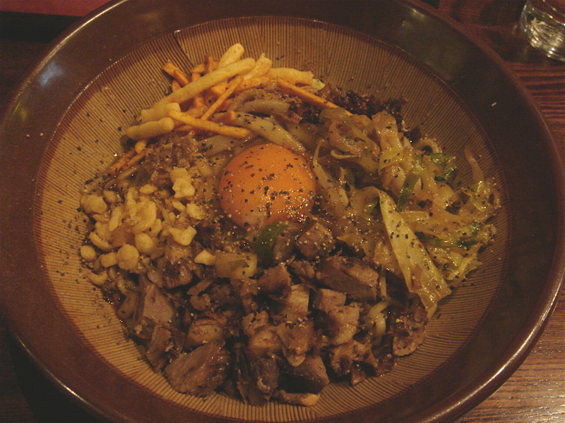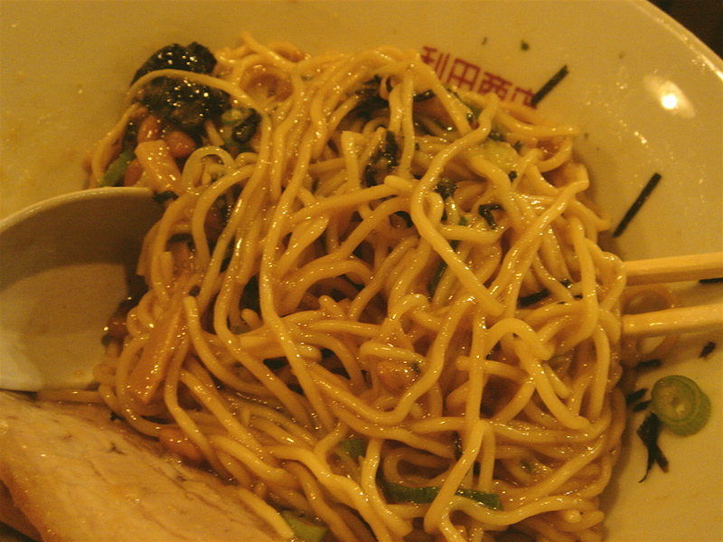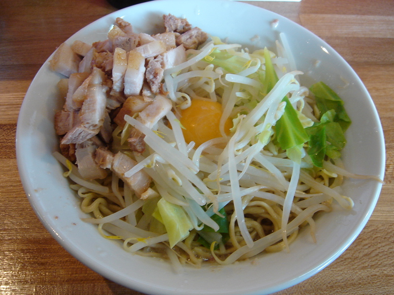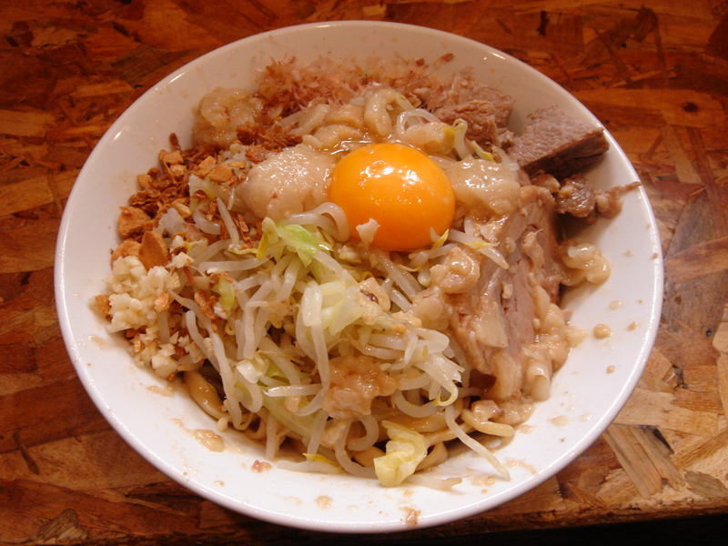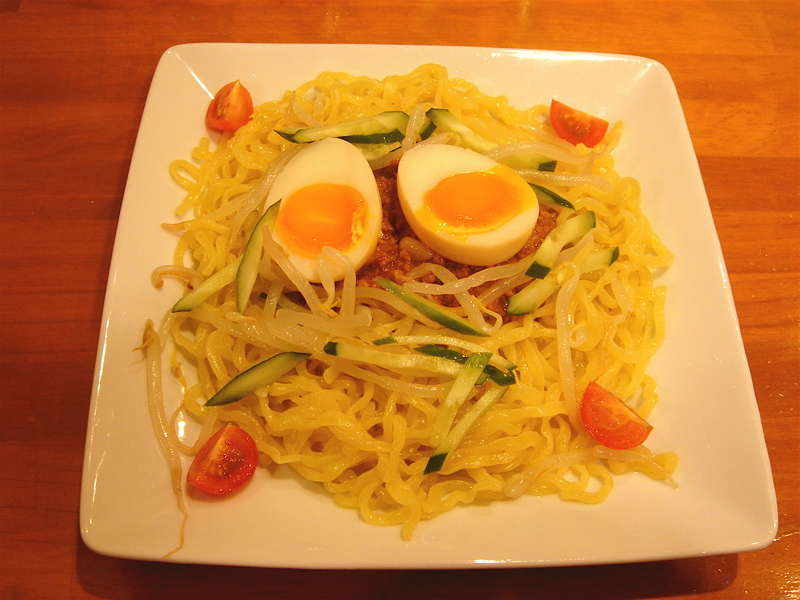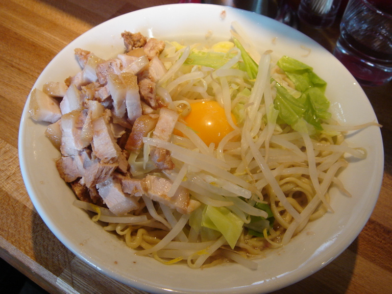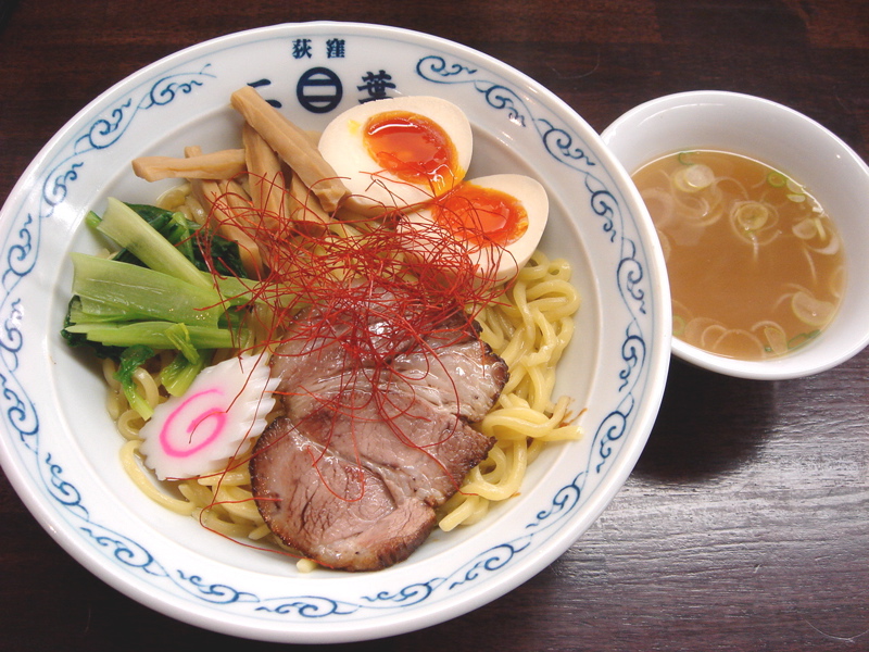 開店五分前に到着、先待ち三人。移転後は初めて。新しく軍鶏冷やし和えそば700円(夏季10食限定)が出たらしいので来てみた。昼は一人でやってるのでカウンターのみ。新作は結構手間のかかっているメニューで大変そうだった。水で締め、ピーナッツオイルやガーリックパウダーなどを和えた麺に軍鶏ダシのジュレをかけ、軍鶏チャーシュー細切り、玉ネギのみじん切りをのせた物。繊細な味わいだが、さっぱりしてうまい。後半、別容器入りのポン酢ジュレを混ぜて食べると、一気に美味さも加速しエンジン全開。味変化系+和えそば系で昨年と今年のトレンドを合体させたようなメニュー。これで700円は大満足で嬉しすぎ。お店のデータは「ラーメンバンク」をクリック!