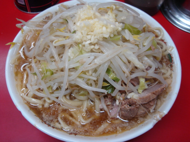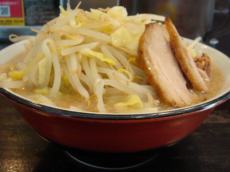スープは乳化して背脂たっぷりの甘いスープ。今から思えば品川二郎に近いかも?チャーシューは脂身が多かった〜。野菜はもやし中心。野菜増しができるかどうかわからなかったのでしませんでしたが、そのままだと野菜はそんなに多くはないです。ニンニクは刻み。